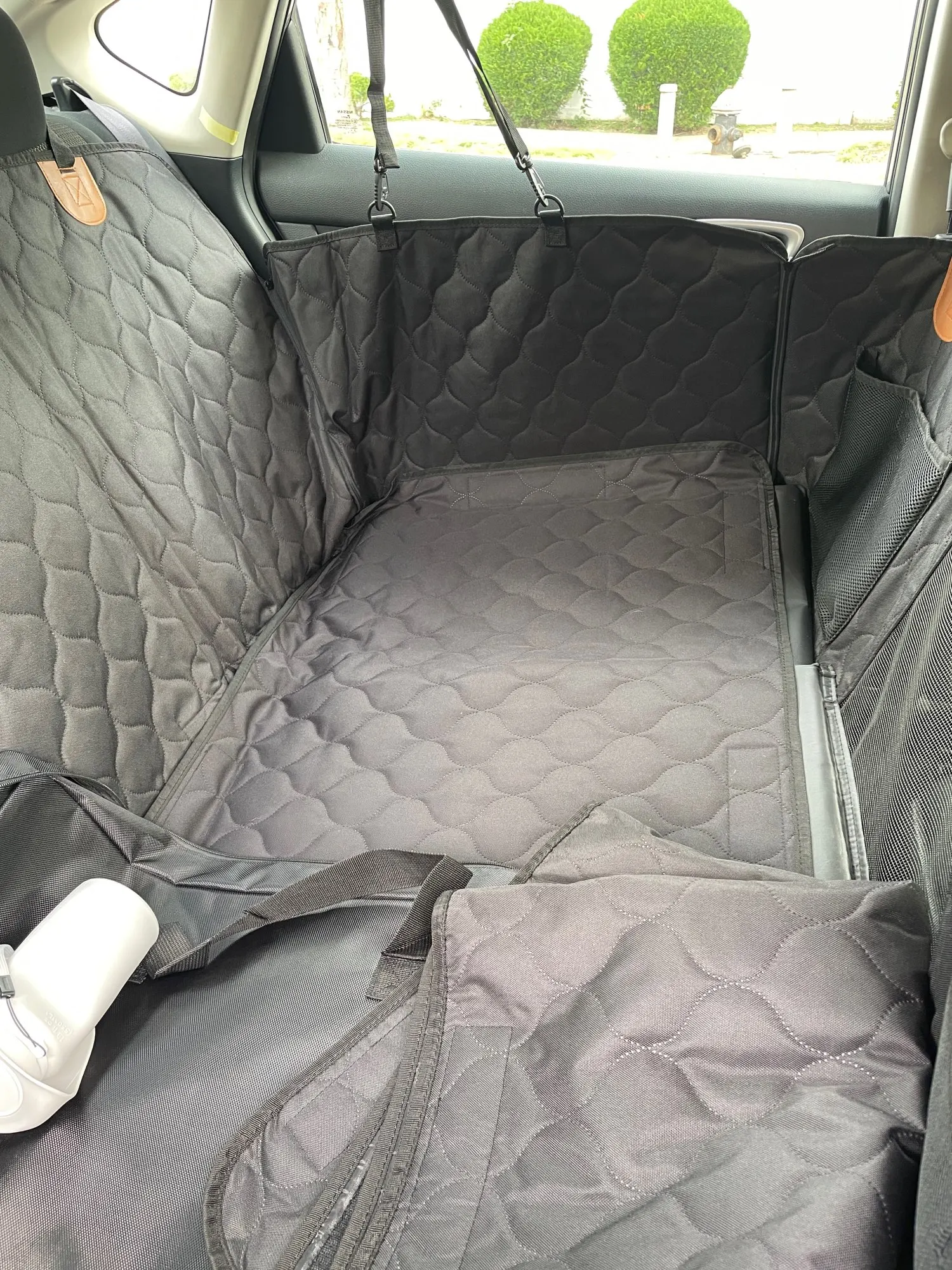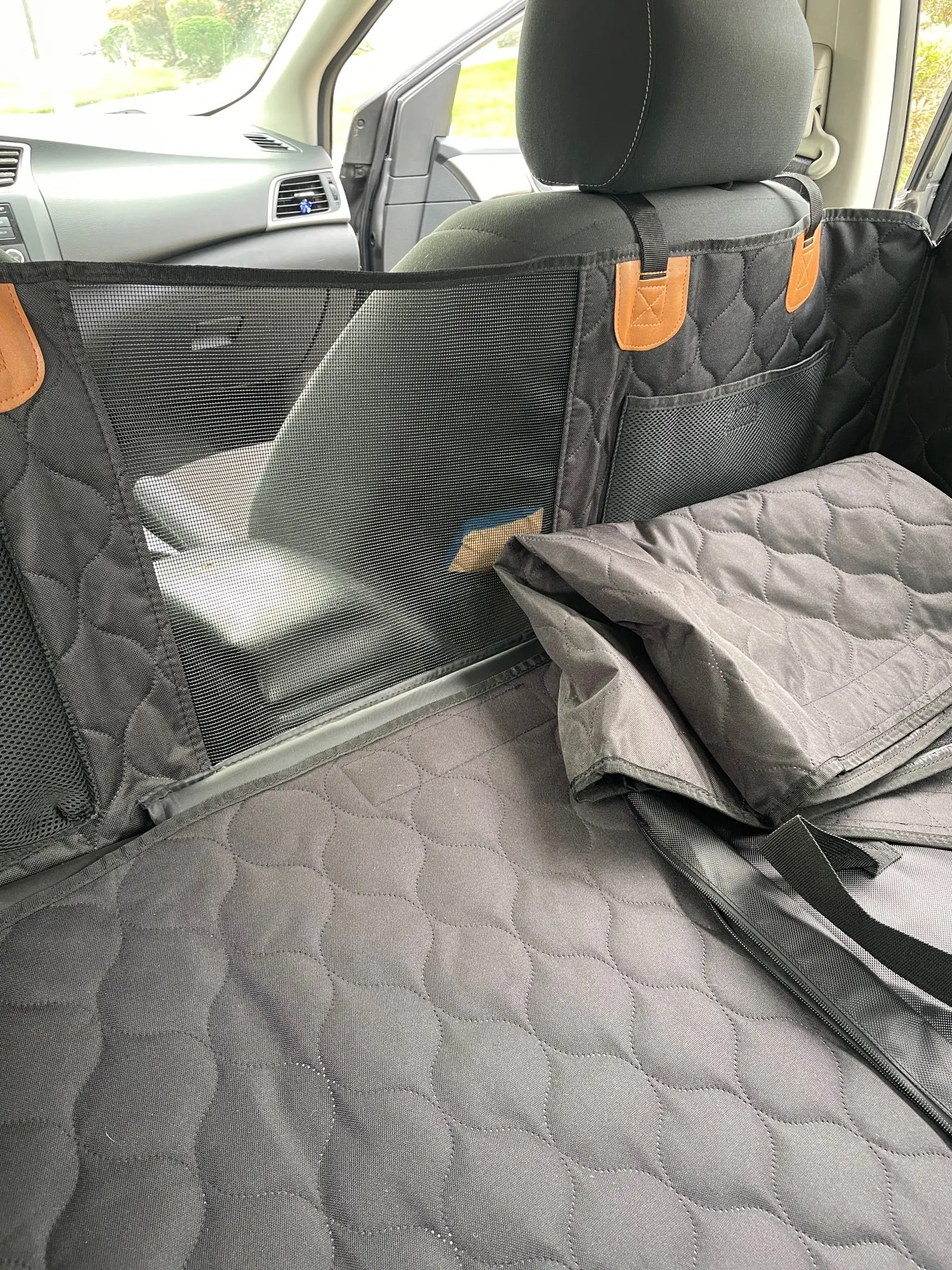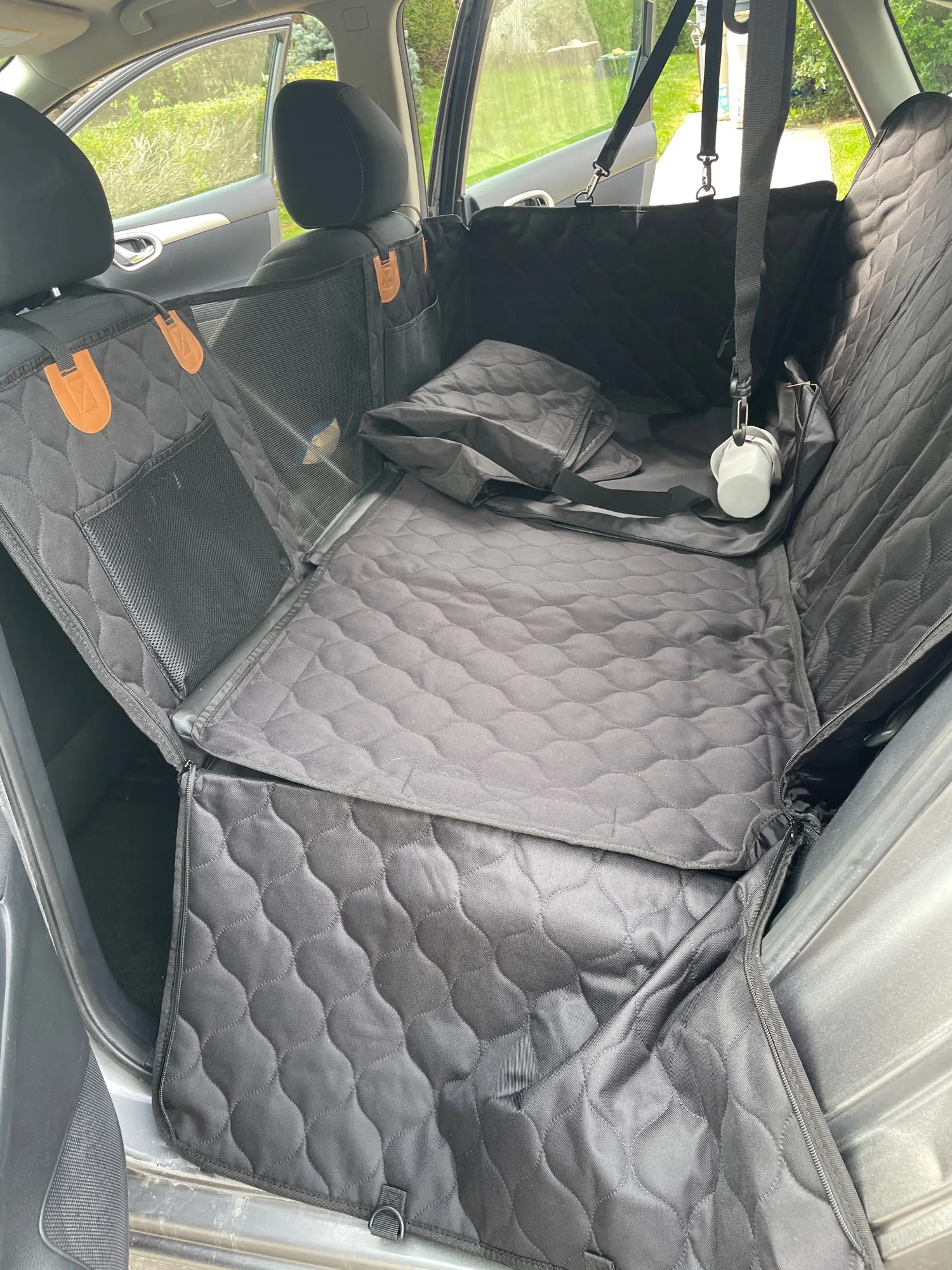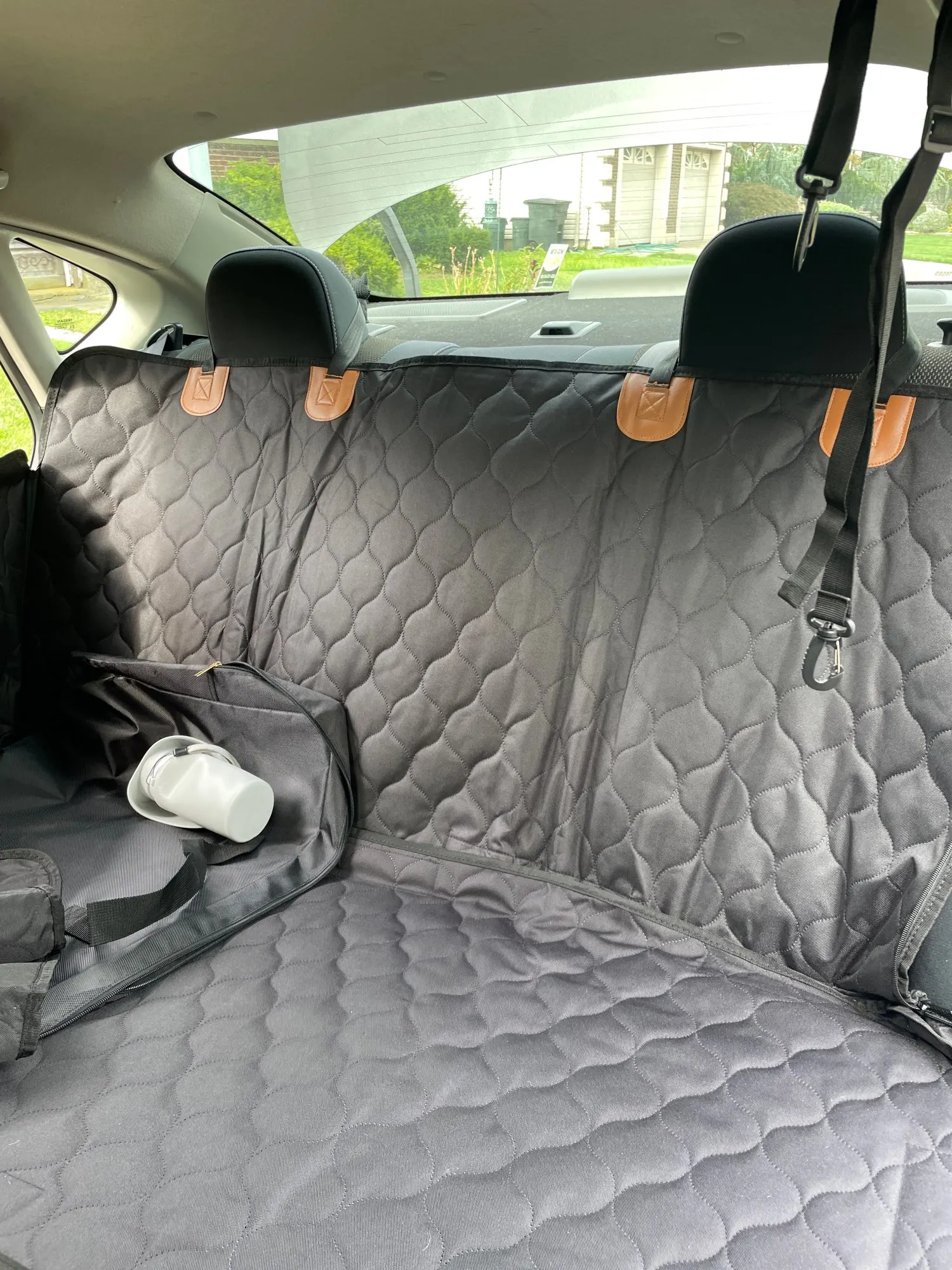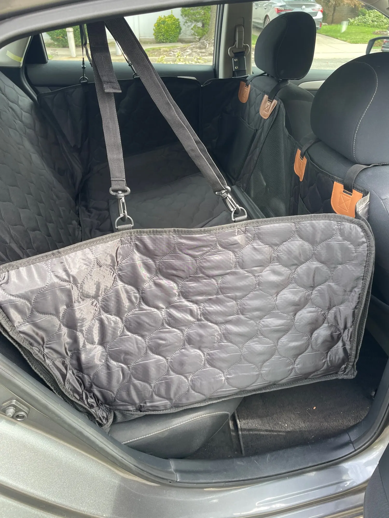 This is a good quality seat protector for the back seat of your car. It super easy to install. It comes with three plastic (?) Inserts. They are very sturdy. The sides zip up and are belted to your handle near the roof. Keeps the dogs from making more of a mess than usual. Once you have the main cover installed loops go over the four head rests. The back gets pushed under the seat where the back meets it. You put the 3 boards across the seat ( now covered) to cover entirely. There’s an additional cover you place over it. My only problem with this great product is the cover is the tiniest bit too small. Maybe 2 inches? To reach the velcro to keep it firmly in place. I’m very sad about this issue. I does come with an extra cover, a dog seat belt to attach to your dogs harness, and a water bottle that has a small cup on the end for water when traveling. It’s very very nice. High quality and sort of high end looking. It even comes with a very nice case to keep it in when not in use.